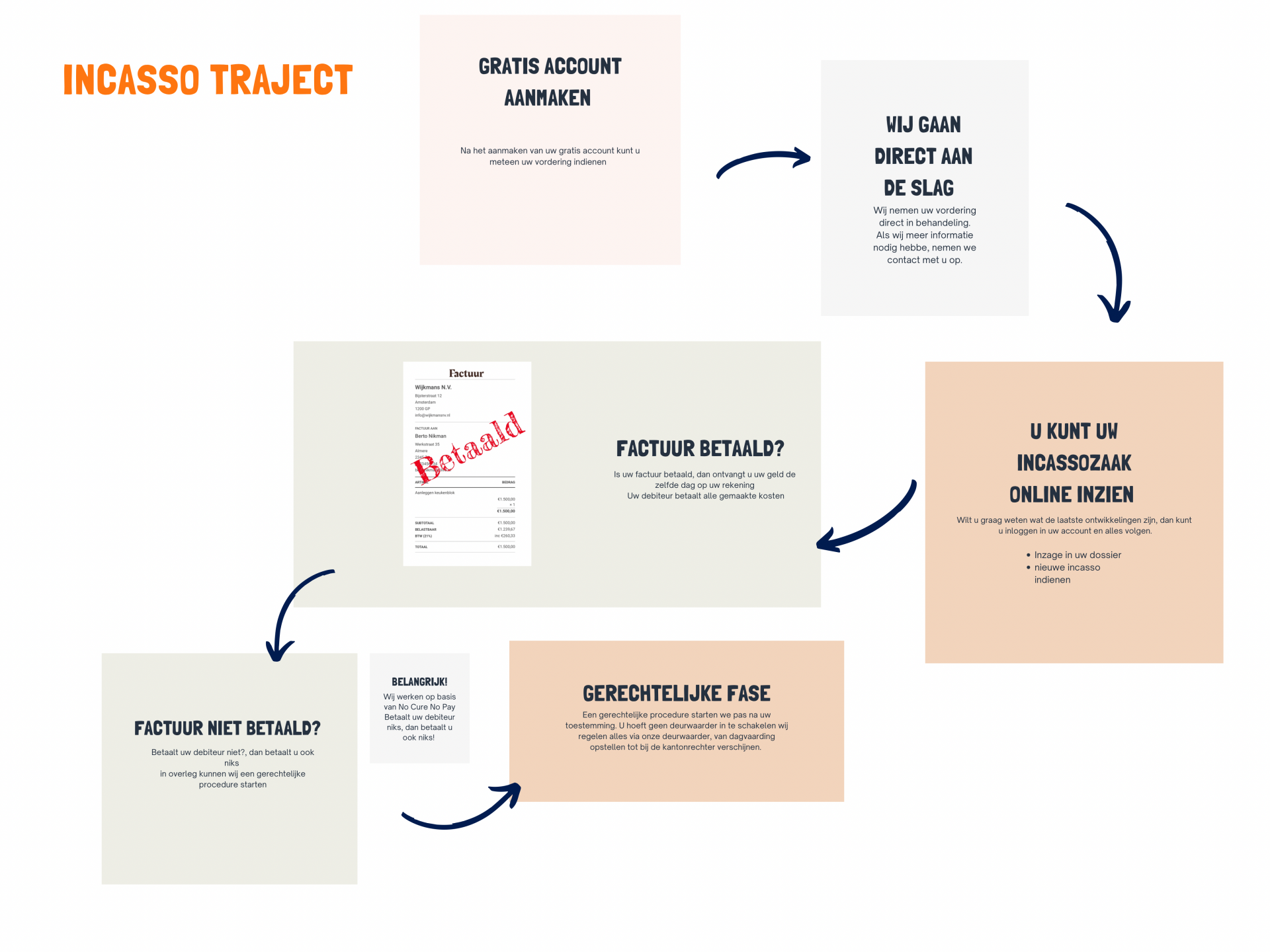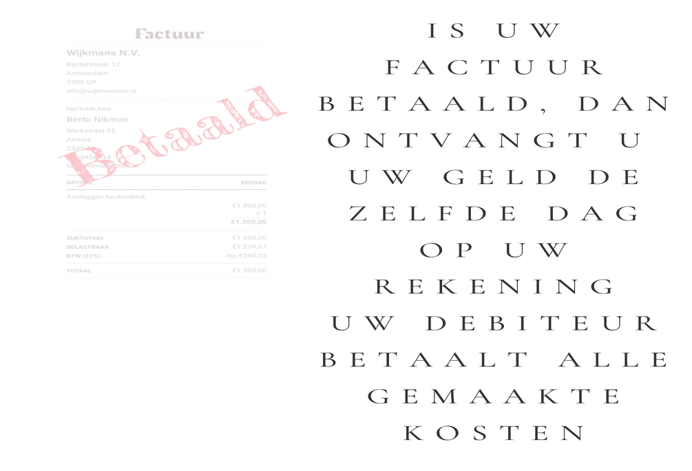Is er niet betaald, dan gaan wij dat voor u regelen met een incassozaak met gebruik van onze unieke pak op basis van no cure no pay.